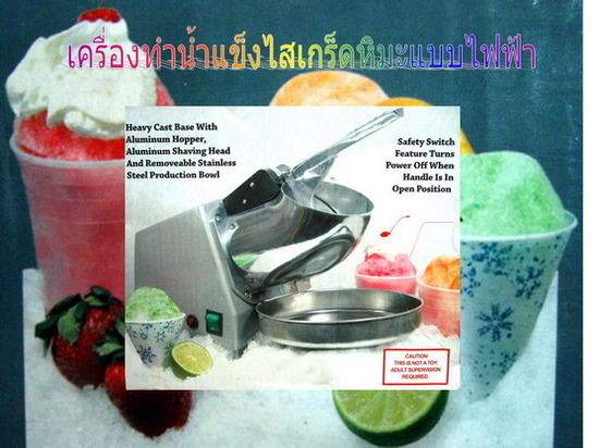 เครื่องไสน้ำแข็งเกล็ดหิมะ (Snow cone) เครื่องทำน้ำแข็งไสไฟฟ้าขนาดเล็ก เหมาะกับหน้าร้อนที่กำลังจะมาถึง ใช่ทำน้ำแข็งใสให้เด็กๆ ทานในบ้าน หรือจะทำขายก็ได้ ใช้งานง่าย /รวดเร็ว เหมาะสำหรับใช้ภายในครัวเรือน หรือทำในปริมาณไม่มากนัก เพียงแต่ใส่น้ำแข็งลงไปในท่อ เปิดเครื่อง จากนั้นก็กดด้ามกดลงน้ำแข็งก็จะไหล ออกมาด้านล่างมีระบบตัดไฟเองเมื่อยกด้ามขึ้นตัวเครื่องทำจากอลูมิเนียม จึงไม่เป็นสนิมส่วนตัวกล่องมอเตอร์ด้านหลังทำจากพลาสติก น้ำหนักจึงเบาเคลื่อนย้ายได้สะดวก ความสามารถ - ใช้ได้น้ำแข็งยูนิต / น้ำแข็งป่น - ความหยาบ / ละเอียดของน้ำแข็ง ขึ้นอยู่กับแรงกด (ถ้าหากค่อยๆกดน้ำแข็งจะออกมาละเอียด / ถ้ากดแรงๆ น้ำแข็งจะออกมาหยาบ - มีระบบตัดไฟอัตโนมัติ น้ำหนักเครื่อง = 8 k.g. ขนาด = 42.5 x 20.5 x 32 cm. Power = 180 w. ราคา 2500 บาท ติดต่อคิ้ม 0866296335 /0823334785 ดูสินค้าอื่นเราได้ที่ http://www.cybermart1.com เครื่องจับยุง,เครื่องดักยุง,เครื่องกำจัดยุงฆ่ายุง,กำจัดปลวกยกรัง,กำจัดมด ยกรัง,กล้องปากกา,ปากาสายลับ ,กล้องหมากฝรั่ง,เครื่องดักฟัง,กล้องแอบถ่าย,กล้องจิ๋ว,กล้องพวงกุญแจ,กล้อง รีโมท,กล้องติดหมวกจักรยาน,กล้องติดรถยนต์,เครื่องฟอกอากาศใน บ้านในรถยนต์,ไบออนแอร์,Bionaire,bap242,412,625,825,830,Hm8510, โอโซน,เครื่องผลิตโอโซน, นาฬิกาแขวน,แว่นขยาย,กล้องจุลทรรศน์,กล้องส่องทางไกล,แว่นขยายสวมหัว,ซองกัน น้ำ,ถุงกันน้ำกล้อง,เครื่องตั้งเวลา,กระเป๋าน้ำร้อนไฟฟ้า,ไฟฉาย,เก้าอี้ เด็ก,เก้าอี้ไฮแชร์,ไม้ม็อบถูพื้นหมุนได้,ไม้ถูพื้นปั่นแห้งได้,easy mop magic mop ,ชุดลดความอ้วน,ชุดกระชับสัดส่วนแบบโอนามิ,เข็มขัดลดความอ้วน,เข็มขัดสลาย ไขมัน,ชุดกระชับสัดส่วนอินฟาเรด,ชุดกระชับสัดส่วนzirana,anqi,สนิม,กัน สนิม,น้ำยาล้างคอยล์ร้อนแอร์,น้ำยาเช็ครอยรั่วแก๊ส,น้ำมันหล่อลื่น อเนกประสงค์,หยุดสนิม,ท่อตัน,ส้วมตัน,งูเหล็ก,เครื่องเจียร์มือไฟฟ้า,ชุด ซ่อมงานไมฟเบอร์กลาสเรซิ่น,ก๊อกน้ำฝักบัวอาบน้ำเรืองแสง,เครื่องชาร์จ แบตเตอรี่รถยนต์ มอเตอร์ไซด์,มิเตอร์วัดโวลท์ดิจิตอล,เครื่องแปลงไฟ,inverter,เครื่องชั่ง น้ำหนัก,เครื่องชั่งดิจิตอล,ไฟled,ไฟประดับ,หมวกโซล่าเซลล์,แท่นโชว์หมุน ได้,แปรงดูดฝุ่น,car mp3,กระเป๋าน้ำร้อน,เครื่องนวด,เครื่องสลายไขมัน,แว่นกันแดด,กาต้มกาแฟ สด,ที่บดเมล็ดกาแฟมือหมุน,กาชงชา,แก้วกรองชา,ชุดซ่อมนาฬิกา,ไม้กวาดไฟฟ้า, ที่บดพริกไทยเม็ด,ที่เปิดขวดไวน์ไฟฟ้า,ที่ดักแมลงวัน,เครื่องทำข้าวโพด,pop corn,นาฬิกาled,ตัวเพิ่มช่องจุดบุหรี่,ไฟฉาย,ไฟฉายled,ไฟเธค,ไฟติดต้นไม้,ไฟ ต้นคริสตมาส,ไฟหิ่งห้อย,ไฟกระพริบ,ไฟประดับ,กล่องควบคุมไฟแอลอี ดี,กล้มอเตอร์หินไฟหินเจียร์,ไฟประดับ,ไฟเธค,น้