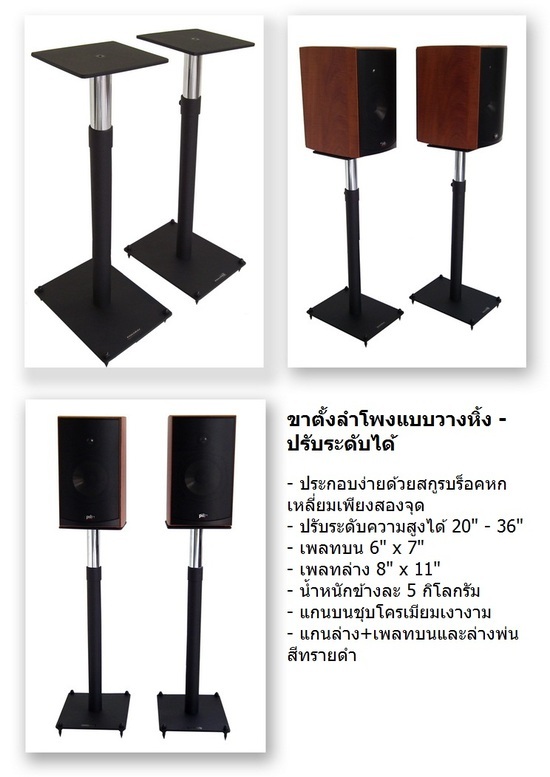 ขาตั้งลำโพงปรับระดับได้ - เป็นของใหม่ไทยทำ - ปรับไดัสูงถึง 3 ฟุต (36") - เหล็กหนาแข็งแรง ต้องนำไปประกอบเองไม่ยาก - มาพร้อมสไปค์เพื่อความเสถียรเมื่อตั้งวางลำโพง จั ดไป 2,500 บาท สั่งงซื้อโทร: 0846602772, 0863308158 ธนาคาร: ไทยพาณิชย์ สาขาจรัญสนิทวงษ์ 48 เลขบัญชี: 1212307537 ชื่อบัญชี: กิติพงษ์ จันทรศิลปิน E-mail: [email protected] ================================ *** รับฝากขายเครื่องเสียงมือสอง ขายไว ได้ราคา