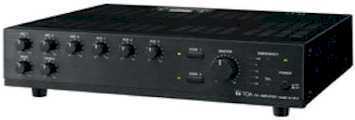A 1803 มิกเซอร์ เครื่องขยายเสียง 2 โซน 30 วัตต์ แอมป์ขยายเสียงระบบประกาศ Mixer Power Amplifiers 30W A-1803 (30W): Multi-purpose, multi-function mixer/power amplifiers specifically designed for maximum versatility and cost-effective high-performance are ideal units for any PA requirement in locations such as schools and offices and other intermediate size environments. A choice of different power outputs are offered as well as functions such as paging and dual zone coverage. Specification Power Source AC mains 50/60Hz, or 24V DC (M4 screw terminal) Output 30W Power Consumption AC operation: 80W (rated output), 37W (EN60065) 24V DC operation: 2.0A (rated output), 1.0A (EN60065) Frequency Response 50 - 20,000Hz ±3dB Distortion Under 2% at 1kHz, rated power Input MIC 1: -60dB*, 600Ω, electronically-balanced, combined type of XLR-3-31 equivalent and phone jack DIN socket (5 pins) MIC 2, 3: -60dB(*1), 600Ω, electronically-balanced, combined type of XLR-3-31 equivalent and phone jack AUX 1(MOH): -20dB*, 10kΩ, unbalanced RCA pin jack AUX 2: -20dB(*1), 10kΩ, unbalanced, RCA pin jack AUX 3: -20dB(*1), 10kΩ, unbalanced, RCA pin jack combined type of XLR-3-31 and phone jack TEL(*2): -20dB*1, 10kΩ, electronically-balanced, M3 screw terminal Output REC: 0dB(*1), 600Ω, unbalanced, RCA pin jack LINE 1,2(*3): 0dB(*1), 600Ω, unbalanced, RCA pin jack MOH: 0dB(*1), 600Ω transformer balanced, M3 screw terminal SPEAKER SELECTOR: 2 zone, high impedance (100V line/330Ω), individual selector switch, M4 screw terminal DIRECT SPEAKER OUT: High impedance (100V line/330Ω),M4 screw terminal Low impedance (4 - 16Ω), M4 screw terminal (Both Low and High impedance terminals cannot be used at the same time.) Phantom Power ON or OFF for each MIC 1 - 3 with switch setting S/N ratio (Band Pass: 20 - 20,000Hz) Over 100dB (Master volume: min) Over 76dB (Master volume: max) Over 60dB (MIC 1 - 3)) Over 76dB (AUX 1 - 3) Over 90dB (TEL) Over 96dB (EMERGENCY) Control Input Bass: ±10dB at 100Hz, Treble: ±10dB at 10kHz TEL: No-voltage make contact input, open voltage: 24V DC, short-circuit: under 5mA, M3 screw terminal EMERGENCY (*4): No-voltage make contact input, open voltage: 24V DC, short-circuit: under 10mA, M3 screw terminal Control Output Power remote: Open collector output, withstand voltage: 35V DC, control current: under 50mA, M3 screw terminal Indicator 5 point LED output level meter, Power indicator LED, Zone indicator LED, Emergency LED, TEL LED Priority EMERGENCY: Overrides other inputs TEL: Overrides other inputs except “EMERGENCY”, ON/OFF selectable with switch setting MIC 1: Overrides other inputs except “EMERGENCY & TEL”, ON/OFF selectable with switch setting