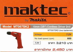 สว่านแบตเตอรี่ ยี่ห้อ มาคเทค Maktec Driver Drill รุ่น MT067SK2 ขนาด 10มม. (3/8") กำลังไฟฟ้า 7.2 วัตต์ ความแรง 600 รอบ/นาที มีใบรับประกันสินค้าให้ 6 เดือน จากบริษัท MAKITA **ขายส่ง-ปลีก อุปกรณ์เครื่องมือไฟฟ้าทุกชนิด บริการส่งทั่วประเทศ**