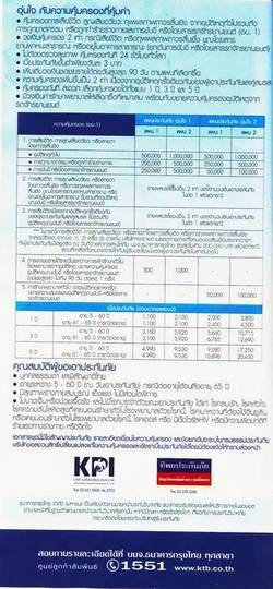 ธนาคารกรุงไทยร่วมกับทิพยประกันภัย KTB PA บริการประกันอุบัติเหตุส่วนบุคคล พร้อมรับทุกสถานการณ์ที่ไม่คาดคิด ครบครันกับความคุ้มครองให้แก่ชีวิต ง่าย ง่าย...KTB PA อุ่นใจ - คุ้ม ครองการเสียชีวิต สูญเสียอวัยวะ ทุพพลภาพถาวรสิ้นเชิง จากอุบัติเหตุทั่วไปรวมถึงการถูกฆาตกรรม หรือถูกทำร้ายร่างกายและการขับขี่ หรือโดยสารรถจักรยานยนต์ (อบ.1) - วงเงินคุ้มครอง 2 เท่า กรณีเสียชีวิต หรือทุพพลภาพถาวรสิ้นเชิง (ยกเว้นการขับขี่ หรือโดยสารจักรยานยนต์) - ไม่ต้องตรวจสุขภาพ คุ้มครองทันที 24 ชม.ทั่วโลก - เบี้ยประกันขั้นต่ำเพียงวันละ 3 บาท - เพิ่มเติมวงเงินชดเชยรายได้ต่อวันสูงสุด 90 วัน ตามแผนที่เลือกซื้อ - คุ้มครองเพิ่มขึ้นเป็น 2 เท่า เนื่องจากอุบัติเหตุครั้งเดียวกันของผู้เอาประกันภัยและคู่สมรส - คุ้มครองทันที สะดวก เลือกคุ้มครองได้ทั้งแบบ 1 ปี , 3 ปี , 5 ปี - มีวงเงินค่ารักษาพยาบาลให้เลือกซื้อที่เหมาะสม พร้อมกับขยายความคุ้มครองอุบัติเหตุจากรถจักรยานยนต์ คุณสมบัติผู้ขอเอาประกันภัย - บุคคลธรรมดา และมีสัญชาติไทย - อายุระหว่าง 5 – 60 ปี (ณ วันเอาประกันภัย) กรณีต่ออายุได้จนถึงอายุ 65 ปี - มีสุขภาพร่างกายสมบูรณ์ แข็งแรง ไม่มีส่วนใดพิการ - ไม่บาดเจ็บหรือป่วยเรื้อรัง และไม่มีโรคประจำตัวขณะเอาประกันภัย ได้แก่ โรคลมชัก , โรคหัวใจ , โรคความดันโลหิตสูง ที่เคยนอนรักษาตัวในโรงพยาบาลด้วยโรคนี้ , โรคเบาหวานที่ต้องใช้อินซูลิน หรือเคยนอนรักษาตัวในโรงพยาบาลด้วยโรคนี้ , โรคเอดส์ หรือมีเชื้อไวรัสHIV หรือมีความผิดปกติที่ร้ายแรงทางร่างกาย หรือจิตใจ สนใจ สมัคร หรือ ติดต่อสอบถามข้อมูลเพิ่มเติมได้ทุกวันที่ เบอร์ (080)099-4939 คุณ ผึ้ง หรือ ฝากเบอร์ศัพท์โทรติดต่อกลับได้ที่อีเมล์