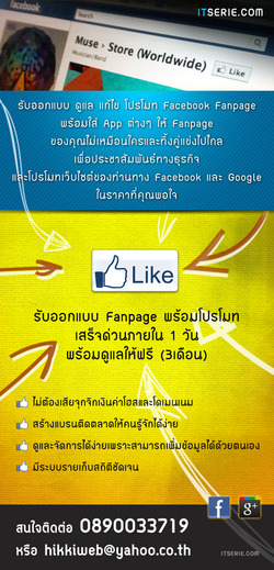 รับออกแบบ fanpage พร้อมโปรโมท เสร็จด่วนภายใน 1 วัน พร้อมดูแลให้ฟรี(3เดือนครับ) พร้อมติดตั้งกล่อง LIKE ในเว็บไซต์ของท่านให้ฟรี (รับประกันถูกกว่าและเสร็จเร็วกว่าเจ้าอื่นในท้องตลาดแน่นอน) รับดูแลแก้ไขโปรโมท facebook หรือ website ตามที่ท่านต้องการ ไม่ต้องเสียเวลาส่งข้อมูลเพิ่มเติมเราสามารถดึงภาพและข้อมูลมาจากเว็บไซต์ ของท่านได้เลย มี ข้อดีเช่น