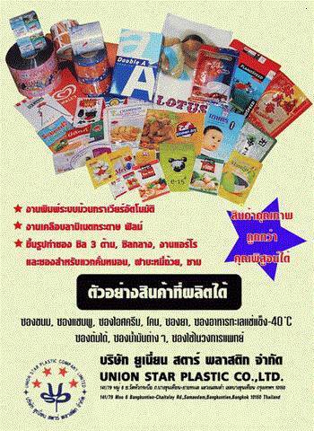 ในปัจจุบันสินค้าประเภทอุปโภคบริโภคนิยมใช้บรรจุภัณฑ์เป็นสิ่งดึงดูดความสนใจจากผู้บริโภค ซึ่งส่งผลให้ยอดจำหน่ายเพิ่มปริมาณสูงขึ้น บริษัท ยูเนี่ยนสตาร์พลาสติก จำกัด เป็นบริษัทฯ ที่ดำเนินกิจการประเภท PACKAGING ระบบกราเวียร์อัติโนมัติ เคลือบพลาสติกบนกระดาษ, ฟิล์ม, OPP, M.CPP, PET, M.PET, NYLON, LLDPE ซองอลูมิเนียมฟอยด์ ขึ้นรูปทำซอง, ซิล3ด้าน, ซิลกลาง รับทำซองแวคคั่ม ในราคาย่อมเยา ผลงานคุณภาพ ส่งตามกำหนด บริการก่อนหรือหลังการขายรวดเร็วและมีประสิทธภาพ
