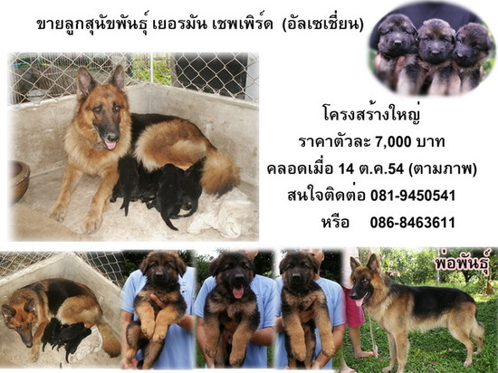 ขายลูกเยอรมันเชพเพอร์ด(อัลเซเชี่ยน) ราคาตัวละ 7,000 บาท พ่อแม่ โครงร่างใหญ่ ภาพลูกสุนัขตัวใหญ่เป็นภาพของคอกที่แล้วตอนอายุ ประมาณ 50 วัน ตามภาพ สนใจติดต่อ 081-9450541