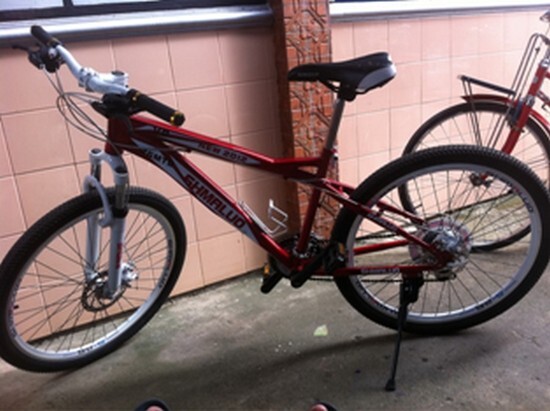 จักรยานยี่ห้อ SHIMALUO คันสีแดง แฮนด์สีขาว ล้อ 26 นิ้ว ดิสเบรก หน้า-หลัง เกียร์ SHIMONO 24 สปีด