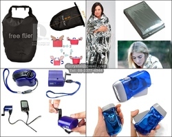 กระเป๋ากันน้ำ 18 ลิตร, ผ้าห่มอวกาศ, ที่ชาร์จแบตไร้ถ่านและไฟฉายไร้ถ่าน