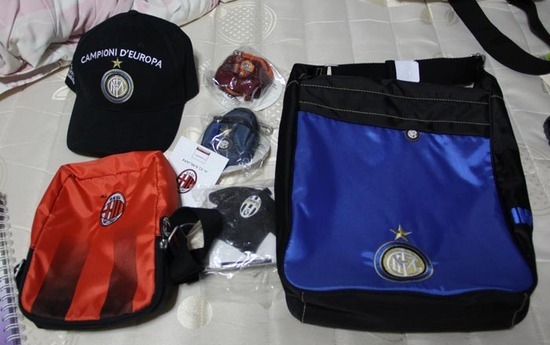 สินค้าของแท้ ซื้อมาจากสโมสรฟุตบอดังจากอิตาลี มีกระเป๋าสะพายข้าง 2 ใบ (ใหญ่อินเตอร์มิลาน 1 เล็กเอซีมิลาน 1) กระเป๋าเล็กใส่เหรียญ 3 ใบ (โรม่า อินเตอร์มิลาน ยูเวนตุส) พวงกุญแจยูเวนตุส หมวกอินเตอร์มิลาน