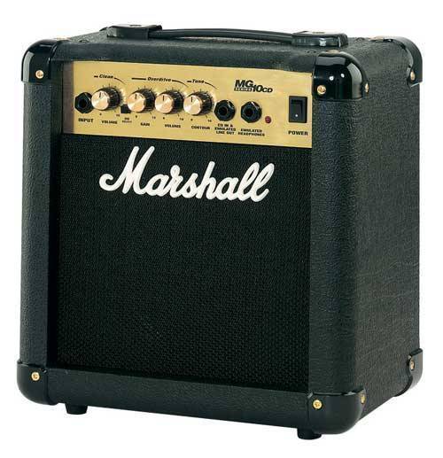 ตู้แอมป์กีตาร์ MARSHALL MG-10 -กำลังขับ : 10 W. -ลำโพง : 6 1/2" -ปุ่มปรับ : 1. CLEAN VOLUME CONTROL 2. CONTOUR CONTROL WHICH SWEEPS THE MIDS 3. OVERDRIVE GAIN and VOLUME -สัญญาณ : 2 INPUT , HEADPHONE JACK , CD INPUT , LINE OUT -เอฟเฟค : OVERDRIVE