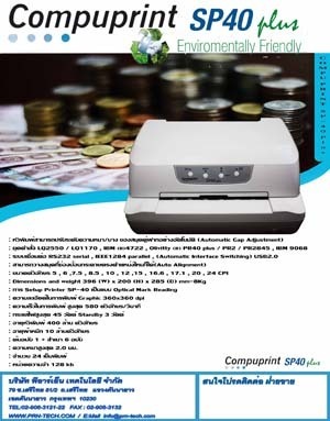 บริษัท พีอาร์เอ็น เทคโนโลยี จำกัด PRN TECHNOLOGY CO., LTD. โทรศัพท์ 0-2906-3121-2 โทรสาร 0-2906-3132 คุณสมบัติเครื่องพิมพ์ยี่ห้อ Compuprint รุ่น SP40Plus ชนิด 24 เข็มพิมพ์ (หัวพิมพ์ปรับระยะอัตโนมัติตามความหนาของสมุดคู่ฝาก/กระดาษ) ระบบการพิมพ์ : หัวพิมพ์สามารถปรับระดับความ บาง/หนา ของสมุดคู่ฝากอย่างอัตโนมัติ(Automatic Gap Adjustment ) จำนวนหัวพิมพ์ : 24 เข็มพิมพ์ ความเร็วในการพิมพ์. : มีความเร็วในการพิมพ์สูงสุด 580 ตัวอักษร/วินาที ขนาดตัวอักษรต่อนิ้ว : 5, 6, 7.5, 8.5, 10, 12, 15, 16.6, 17.1, 20, 24CPI ระบบการ Setup เครื่องพิมพ์ : การ Setup printer SP40 เป็นแบบ Optical Mark Reading ทางเข้ากระดาษ : สามารถวางสมุดที่ช่องป้อนกระดาษตรงตำแหน่งไหนก็ได้ (Auto Aliqnment) ความละเอียดในการพิมพ์ : Graphic 360x360 dpi ชุดคำสั่ง (EMULATIONS) : Emulations IBM ® Personal Printer 2390+, Proprinter XL24E, Proprinter XL24E-AGM and Epson ® : LQ2550/ LQ1170,IBM ® 4722, Olivetti ® PR40 plus/PR2/PR2845, IBM 9068 ความกว้างของพื้นที่การพิมพ์ : 94 Characters at 10 CPI ระบบต่อเชื่อม(มาตรฐาน) : RS232 serial, IEEE1284 parallel, (Automatic Interface Switching) USB 2.0 อายุหัวพิมพ์ : 400 ล้านตัวอักษร ( ถึง 1 พันล้านตัวอักษร ) ความหนาของกระดาษ : สูงสุดถึง 2.0มม. จำนวนสำเนา : (ต้นฉบับ 1 + สำเนา 6ฉบับ) อายุผ้าหมึก : 10 ล้านตัวอักษร ระดับเสียงการพิมพ์ : 54 dBA หน่วยความจำ :128 Kb กระแสไฟ :สูงสุด 45วัตต์ Standby 3 วัตต์ ขนาด (H x W x D) : 200 x 396 x 285 mm. น้ำหนัก : 8 Kg. ***ใช้งานง่าย ทันสมัยกว่า*** กรุณาติดต่อ คุณสรายุทธ์ ศรีหาจันทร์ (086-4797162) ( 081-6683281 ) Email:
