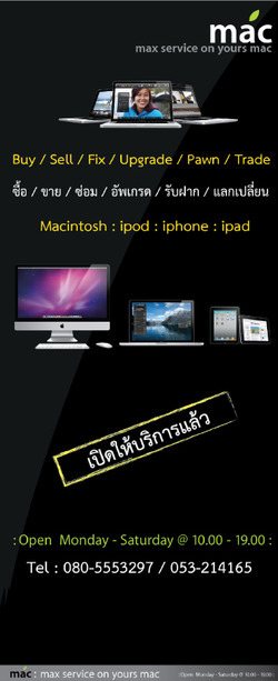 บริการรับซ่อม macintosh / ipod / iphone / ipad ด้วยประสบการณ์ที่กล้ายืนยันได้ว่าน๊อตจะไม่หายไปจากเครื่องท่านแม้แต่ตัวเดียว พร้อมทั้งดูแลการซ่อมด้วยตัวผมเองซึ่งเป็นเจ้าของร้านจึงทำให้ท่านมั่นใจได้ ว่าเครื่องของท่านจะถูกซ่อมและการบริการที่เต็ม 100% โดยทางร้านมีอะไหล่ไว้พร้อมเปลี่ยนทันทีไม่ต้องรอสั่งจากกรุงเทพฯ ในราคาที่ไม่ต่างจากกรุงเทพเลยฯ