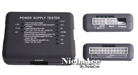 เครื่องเทส Power Supply ใช้สำหรับทดสอบ Power supply เพื่อหลีกเลี่ยงความเสียหายต่ออุปกรณ์คอมพิวเตอร์ เพียงแค่เสียบเครื่องเทส กับ pin ของแหล่งจ่ายไฟ 20/24 รวดเร็วและง่ายดายในการใช้ : เพียงเสียบกับแหล่งจ่ายไฟ (Power Supply) ต่อได้ทั้ง 20 และ 24 pin ขนาด : 9 x 7 x 3cm ทดสอบไฟ +3.3 V, +5 V, + VSB, - 5V, - 12V และ +12 v ไฟ LED สีเขียวแสดงสถานะได้อย่างรวดเร็ว ดูรายละเอียดเพิ่มได้ที่ www.NichaAcc.com