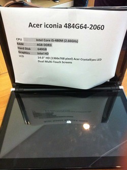-CPU Intel Core i5-480M (2.66GHz) -RAM 4GB DDR3 -HDD 640GB -Graphics Intel HD -LCD 14.0" HD (1366x768 pixel) Acer CrystalEyes LED Dual Multi-Touch Screens สภาพดีมากๆ ใช้มา 4 เดือน เหลือประกันศุนย์ 7 เดือน ขาย 32,900 บาท สนใจโทร 0819611440 ครับ