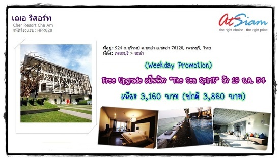 โปรโมชั่นวันธรรมดา เพียง 3,160 บาท (ปกติ 3,860 บาท) ที่ เฌอ รีสอร์ท (ชะอำ)
