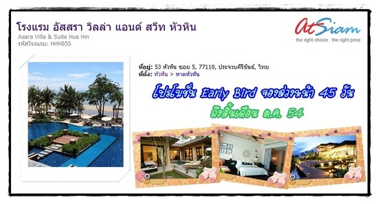 โปรโมชั่น Early Bird จองล่วงหน้า 45 วัน เพียง 5170 บาท ที่ อัสสรา วิลล่าฯ (หัวหิน)