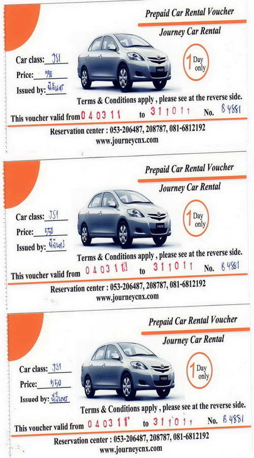 ขาย voucher เช่ารถที่เชียงใหม่ หมดเขตวันที่ 31 ตุลาคม 2554 ขายราคา 3 ใบ 1300 บาท พร้อมส่ง ems สนใจติดต่อแอน 089-168-4993 ตลอด 24 ชั่วโมง