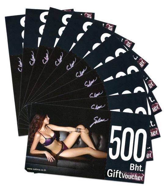 มี Gift Voucher ซาบีน่าขาย บัตรมูลค่า 500 บาท จำนวน 10 ใบ แต่เราขายในราคา 300 บาท _ ใช้แทนเงินสดได้ ซื้อสินค้าซาบีน่าเท่านั้น _ใช้ได้ทุกสาขา _ หมดเขต 31 พ.ค. 2554