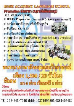 โฮปแอคาดามี่ (ตั้งอยู่ตรงอนุสาวรีย์ชัยสมรภูมิ) มีเป้าหมายที่จะจัดชั้นเรียนภาษาที่หลากหลายและมีคุณภาพให้กับสังคม ด้วยราคาที่สมเหตุสมผล และมอบโอกาสให้กับคนที่ต้องการที่จะเรียน เข้ามาเรียนภายใต้บรรยากาศที่สบาย และเอื้อต่อการเรียนภาษา ในราคาที่เป็นกันเอง เป้าหมายของเราคือการทำให้ผู้เรียนสามารถพูดภาษาอังกฤษได้เป็นภาษาที่สอง และใช้ภาษาอังกฤษ ภายในบริษัทและระหว่างการเจรจากับลูกค้าได้อย่างมั่นใจ สถาบันของเราสามารถบรรลุสิ่งเหล่านี้ได้โดยการฝึกคำศัพท์ที่จำเป็นและบทสนทนาที่เกี่ยวข้องกับการทำงานและการใช้ชีวิตประจำวัน เราใช้วิธีการหลากหลาย เพื่อที่จะทำไห้ผู้เรียนรู้จักภาษาที่สำคัญในการทำงานโรงแรม รวมถึงการสวมบทบาท การแลกเปลี่ยนข้อมูล การเน้นคำ การเน้นประโยค และการฝึกออกเสียง คอร์สเรียนของเรา ภาษาอังกฤษเพื่อการสนทนา-IELTS-ภาษาอังกฤษสำหรับเด็ก-ภาษาอังกฤษเพื่อองค์กรและธุรกิจ-SAT-CU-TEP-TOIEC-ภาษาจีนO-Net, A-Net และ Admissions-ชั้นเรียนที่บ้าน / สำนักงาน สถาบันของเรามีคอร์สเรียนสำหรับเด็กและผู้ใหญ่ ไม่ว่าจะเป็นการใช้ภาษาอังกฤษทั่วไป หรือการใช้เพื่อธุรกิจ นอกจากนี้ยังมีการสอนนอกสถาบัน เช่น หลักสูตรโรงเรียนรัฐบาล และ ที่ทำงาน ซึ่งรวมถึงสถานประกอบการทั่วไป ตั้งแต่โรงแรม สำนักงาน โรงงาน และ องค์กรการศึกษา. ด้วยหลักสูตรครอบคลุมที่ทันสมัยและเป็นนานาชาติ ประกอบกับครูเจ้าของภาษาที่มีคุณสมบัติและประสบการณ์มากมาย สถาบันของเราสามารถพัฒนาความสามารถของนักเรียนและให้ความรู้ที่ดีที่สุดที่จำเป็นต่อความสำเร็จของพวกเขา