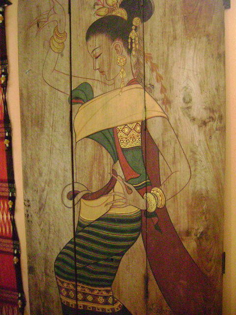 บานประตูไม้เก่า(บ้านเพี้ยมพับได้) มีภาพวาดหญิงแต่งกายคล้ายสาวเหนือกำลังฟ้อนรำ เดิมเจ้าของจะเก็บไว้ตกแต่งสวน บริการส่งฟรีถึงบ้าน