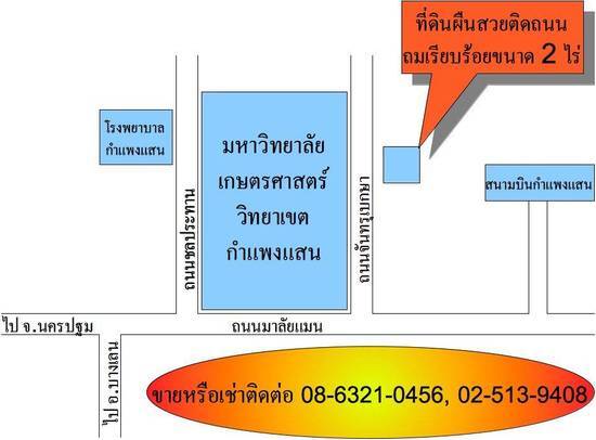 ขายที่ดินผืนสวย ถมเรียบร้อย หน้าโครงการหมู่บ้าน ข้างมหาวิทยาลัยเกษตรศาสตร์ วิทยาเขต กำแพงแสน ถนนจันทรุเบกษา ตารางวาละ 7000 บาท สนใจรบกวนติดต่อที่ 025139408, 0863210456, 0818584252 ....บรรลือศักร