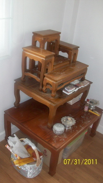 ใช้มา16 ปีพอดีทำหิ้งพระใหม่ครับ ชุด 6 ชิ้นเล็ก + 1 โต๊ะใหญ่