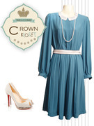 ชุดกระโปรงทำงาน / ชุดเดรส Vintage สีฟ้าแขนยาว คอลูกไม้สีขาว Dress41