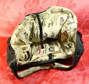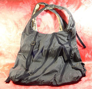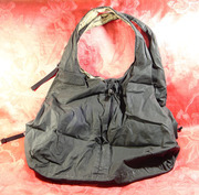 กระเป๋าผ้าทำจากผ้าร่ม สีเทาดำ ด้านในมีกระเป๋าซ่อนอยู่สี่ช่อง และมีกระเป๋าสตางค์ใบเล็กติดอยู่ด้านในอีกหนึ่งใบด้วย ขนาดกระเป๋า กว้างxยาวxสูง=30x36x37 cm. สายยาว 59 cm. ปรับไม่ได้ www.mangmee.net