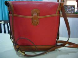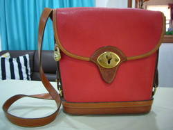 กระเป๋าสะพาย ยี่ห้อ Dooney&Bourke(บางคนเรียกว่า กระเป๋าเป็ด เพราะว่าโลโก้ เป็นรูปเป็ด) รุ่นคลาสสิค ซื้อมาจาก USA ขนาด H 10 x L 10 x W 3", มีช่องด้านหลังของกระเป๋า ส่วนในตัวกระเป๋า มีอีก 2 ช่อง มีซิป 1 ช่อง ไม่มี 1 ช่อง สายสำหรับสะพายสีน้ำตาลยาวประมาณ 20 " สามารถปรับความยาวได้ ตัวกระเป๋าสีแดง ขลิบสีน้ำตาล สภาพค่อนข้างใหม่ ใช้ประมาณ 5 - 6 ครั้งเท่านั้น