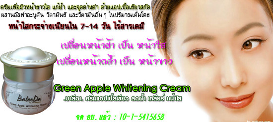 กรีนแอปเปิ้ล ไวท์เทนนิ่งครีม ครีมหน้าใส ที่ลูกค้าใช้แล้วต่างตอบรับว่า นี่แหละ ใช่เลย หน้าใสเห็นผล เนื้อครีมเนียนนุ่ม และสบายผิวมาก ด้วยส่วนผสมสมุนไพรและเวชสำอางค์เต็มเปอร์เซนต์ จึงเห็นผลได้จริงในเวลาไม่นานนัก หมายเลขจดแจ้ง อย. : 10-1-5415658