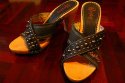 รองเท้าส้นสูง Replay แบบสวม ตัวพื้นรองเท้าทำจากไม้ สายรองเท้าผสมผสานกันระหว่างหน้งสีดำปักด้วยหมุดกับผ้า เบอร์ 38 สูง 3 นิ้ว