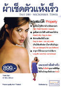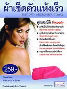 ผ้าเช็ดตัวแห้งเร็ว ไมโครไฟเบอร์ micro fiber towel มี 3 ขนาด คือ ขนาดเล็ก 50x50 cm ราคา 159.- มีสี แดง น้ำเงิน เขียวเข้ม ฟ้า ชมพูช๊อกกิ้งพิ้ง ขนาดกลาง 80x50 cm(ขายดีอันดับ1) ราคา 259.- มีสี ชมพูอ่อน เขียวอ่อน ส้ม เหลือง เทา เนื้อ ฟ้า ขนาดใหญ่ 100x200 cm ราคา 899.- มีสี ฟ้า ผ้าเช็ดตัวปกติ ไม่ว่าจะเป็นแบบดีหรือดีน้อยยังไง เวลาใช้ไปสักพัก ผ้าจะลื่นแล้วก็ขาด อายุการใช้งานไม่นานเท่าไหร่ แต่ว่า ผ้าเช็ดตัวไมโครไฟเบอร์ มีคุณสมบัติที่ดีกว่ามากๆๆๆหลายอย่าง เป็นที่นิยมมากในประเทศญี่ปุ่น เกาหลี และแถวประเทศยุโรป ผ้าเช็ดตัวแห้งเร็ว ไมโครไฟเบอร์ มีคุณสมบัติดีมากๆหลายอย่าง 1.ดูดซับน้ำได้ดีมากกว่าผ้าปกติ ประมาณ 5-7 เท่า เช็ดตัว เช็ดผม แห้งอย่างรวมเร็ว