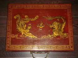 ชุดไพ่นกกระจอกจีน ขนาดมาตรฐาน บรรจุุอยู่ในกล่องไม้บุด้วยหนังแท้ ลายมังกร&หงส์ ตัวไพ่ครบเซตแกะสลักอย่างสวยงาม หายาก หนักมาก