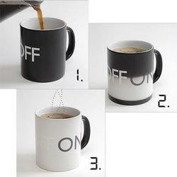 ถ้วยกาแฟ (ON/OFF) แก้วน้ำเปลี่ยนสี แก้วนี้เมื่อโดนความร้อนแก้วจะเปลี่ยนเป็นสีขาว สถานเป็น ON เมื่อน้ำในแก้วเย็นลงจะเปลี่ยนเป็นดำ สถานะเป็น Off เป็นสินค้าไอเดียเก๋มากเลยค่ะ