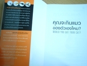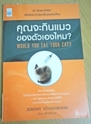 ชื่อหนังสือว่า คุณจะกินแมวของตัวเองไหม? (Would you eat your cat?) ค้นหาตัวเองจากปัญหาเชิงจริยธรรมที่น่าขบคิด 25 ปัญหาท้าคิด เพื่อค้นหาว่าคุณเป็นคนแบบไหน ห่อปกใส