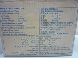 เนยจืด (Unsalted Butter) ตรา Anchor ขนาด 25 กิโลกรัม/ก้อน ผลิตจากนิวซีแลนด์ ราคา 247 บาท/กก (ก้อนละ 6175 บาท)