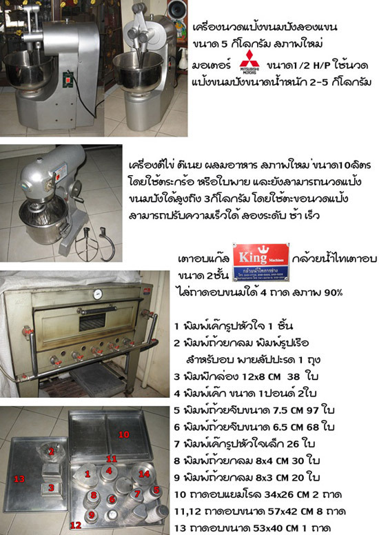 1.ขายเตาอบขนมระบบแก๊สสองชั้นไส่ใด้4ถาด กล้วยน้ำไทการช่าง พร้อมถาดและแม่พิมพ์ 2.เครื่องนวดแป้งสองแขนแชมป์ขนาด5กิโลกรัม 3.เครื่องตีไข่ขนาด10ลิตร พร้อมหัวตีตะขอ ใบโพธิ์ ตระกร้อ พร้อมแถมสูตรขนมที่เคยทำขายให้ด้วยค่ะ