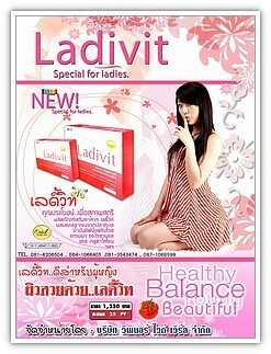 ผลิตภัณฑ์เสริมอาหารสำหรับสตรีเลดี้วิท(Ladivit) มีส่วนประกอบจากธรรมชาติ คือ สารสกัดจากเปลือกสน สารสกัดจากเมล็ดองุ่น สารสกัดจากถั่วเหลือง คลอลาเจนจากปลาทะเล โคเอนไซม์-คิวเท็น กลูต้าไธโอน เลดี้วิทช่วยทำให้ลดริ้วรอย ร่องลึก เลดี้วิทช่วยยับยั้งการเกิดฝ้า กระ จุดด่างดำ เลดี้วิทยับยั้งการสร้างเม็ดสีผิว เลดี้วิททำให้ผิวขาวเนียนใสชุ่มชื้นทั่วทั้งใบหน้าและลำตัว ช่วยกระชับรูขุมขน ลดการเกิดสิว ต้านอนุมูลอิสระ วิธีการรับประทานเลดี้วิท ครั้งละ 2 เม็ดก่อนนอนครึ่งชั่วโมง เลดี้วิทเป็นผลิตภัณฑ์ที่ได้รับการรับรองจากอย.เลขที่ อย. 10-1-30547-1-0031 สนใจติดต่อสอบถามได้ที่โทร.0875206925,0801618697 หรือดูรายละเอียดเพิ่มเติมได้ที่ http://www.adoxymaesod.com/index.php?