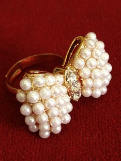 แหวนแฟชั่นลายโบว์น่ารัก เหมาะกับสาวหวาน กิ๊บเก๋ ประดับด้วยลูกปัดมุขสีขาว ขนาดขยายได้ตามนิ้วของผู้ใส่