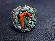 กำไลเงิน อเมริกัน-อินเดียน Indian natives. ควอยส์แท่ง 8 เม็ดล้อม + ควอยส์อริโซนา เม็ดกลาง + ปะการังกิ่งสีแดงสด หายาก น่าเก็บสะสม สอบถามรายละเอียดก่อนได้ครับ