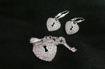 จี้พร้อมต่างหูเป็นชุดรูปหัวใจ ตัวเรือนเป็นเงินแท้ฝังพลอยขาว