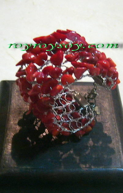 หินปะการังแดงถักกับลวดลามิเนตแบบนุ่ม เป็นสร้อยข้อมือ หรืออาจจะดัดแปลงใช้เป็น ที่สวมผ้าเช็ดปากบนโต๊ะอาหาร (Napkin ring)ก็ดูเท่ห์ดีครับ คุณสามารถชมสินค้าเพิ่มเติมที่www.royroysoy.com