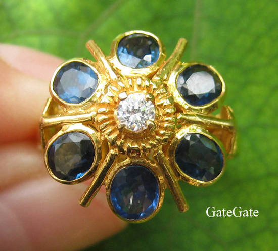 แต่ ณ ปัจจุบันเปลี่ยนเป็นเพชรรัสเซียเหมือนเดิมแล้วค่ะ ล้อมด้วยไพลินแท้ จำนวน 6 เม็ด สีน้ำเงินเข้มเสมอกันทุกเม็ด