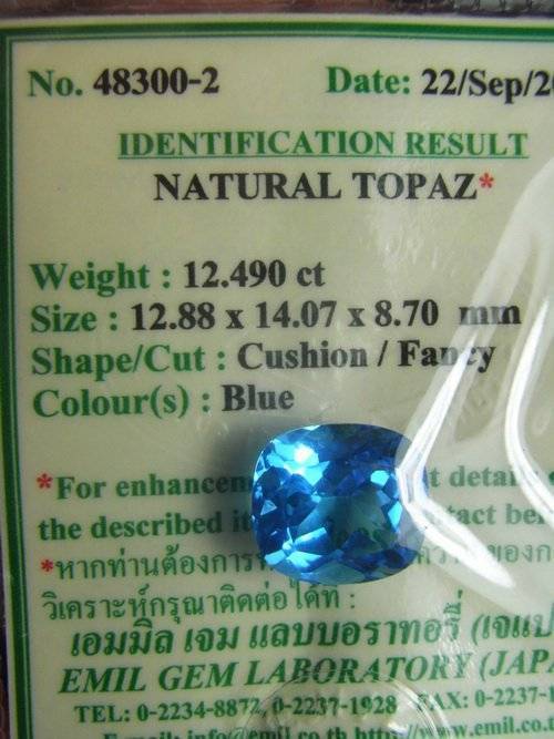 บลูโทพาส 12.49 กะรัตพร้อมเซอร์ฯ