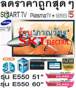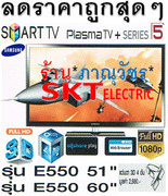 **สนใจติดต่อร้าน ภาณุวัชร-skt คลอง3-ดรีมเวิลด์(รังสิต-ธัญบุรี)ปากซอยสะอาด:ติดเซเว่น:ตำบลบึงยี่โถ** >>โทร 0847678965-0843576689-029909487 << - Click...ดูสินค้าอื่นๆ>>> http://www.skt-electric.com/ <<< >> ติดต่อ-ต่อรองราคาโดยตรง *ภาณุวัชร*เจ้าของร้าน << - PS51E550ราคาออกห้าง 39,990 บาท>>ลดราคาพิเศษ>>33,500 บาท รายละเอียด: ดีไซน์ * ดีไซน์หรูแบบToC Design Charcoal Black ภาพ * เทคโนโลยี 3D HyperReal Engine ช่วยเพิ่มคุณภาพและความคมชัดของภาพเพื่อที่สุดของประสบการณ์มันส์ ทะลุจอ * จอภาพแบบ Full HD 2 ล้าน Pixel ความละเอียดภาพระดับ 1920x1080 จุด * เทคโนโลยี 2D to 3D Conversion เปลี่ยนรายการทีวีธรรมดาในระบบ 2D เป็น 3D ได้ทันที * Wide Color Enhancer Plus ให้ภาพมีความสดใน สวย สมจริงเป็นธรรมชาติ * Digital Noise Filer ลดสัญญาณรบกวน เพื่อให้ได้ภาพที่ชัดเจนตลอดเวลา * จอภาพดำสนิทแบบ Clear Image Panel ช่วยให้ภาพมีมิติสมจริงด้วย Mega Contrast Ratio * แสดงภาพเคลื่อนไหวได้ราบรื่น ต่อเนื่อง ด้วยเทคโนโลยี 600Hz subfield motion Response Time 0.001ms * แสดงภาพเสมือนดูจากโรงภาพยนต์ด้วย เทคโนโลยี Cinema Smooth เสียง * ระบบเสียง Dolby Digital Plus, Dolby pulse จำลองเสียงรอบทิศทางเสมือนได้เข้าไปอยู่ในเหตุการณ์ * ลำโพงพลังเสียงรวม 20 วัตต์ (RMS ) (10W + 10W) * ส่งสัญญาณเสียงแบบ DTS 2.0 ผ่านช่องต่อ Optical เพื่อเชื่อมต่อชุดเครื่องเสียงภายนอก เพื่อตอบสนองความต้องการระบบเสียงที่สมบูรณ์แบบ การต่อเชื่อม * ช่องต่อ HDMI x 3 เพื่อการเชื่อมต่อระบบภาพและเสียงแบบ Digital 100% * ช่องต่อ USB(Movie HDD) x 2 รองรับไฟล์ ภาพ เพลง และภาพยนต์ * ครบครัน ด้วยการเชื่อมต่อแบบ AV x 1 , DVD Component x 1 * รองรับการส่งสัญญาณเสียงออกแบบ Digital ผ่านช่องต่อ Optical Output ฟังค์ชั่นเสริม * ระบบ SMART HUB นำคอนเทนต์ต่างๆมารวมไว้บนหน้าจอเพื่อประสบการณ์การรับชมทีวีที่ไร้ขีดจำกัด ด้วยฟังก์ชั่น Web Browser, Social TV, Search All และ Your Video * ระบบ All Share รองรับการ แชร์ข้อมูลผ่านระบบ DLNA กับหลากหลายอุปกรณ์ ไม่ว่าจะเป็น Notebook, เครื่องเล่น MP3, หรือกล้องดิจิตอล * Wi-FI- Built-in รองรับการเชื่อมต่อโลกออนไลน์แบบไร้สาย * ระบบ ภาพซ้อนภาพ (PIP) 1 จูนเนอร์ * รองรับเมนูภาษาไทย (Thai OSD) * ประหยัดไฟกว่า 40% ด้วยเทคโนโลยีประหยัดพลังงานและ Eco Sensor ร้านเชื่อถือได้-บริการดี-มีความจริงใจ-เจ้าของขายเอง **จำหน่ายเครื่องใช้ไฟฟ้า**