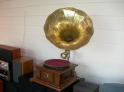 เครื่องเล่นแผ่นเสียงโบราณ ปากแตร ฐานแปดเหลี่ยมและฐานไม้สี่เหลี่ยม สภาพสวยใช้งานได้ตามปกติ เป็นระบบไขลาน สำหรับนักสะสมไม่น่าพลาด