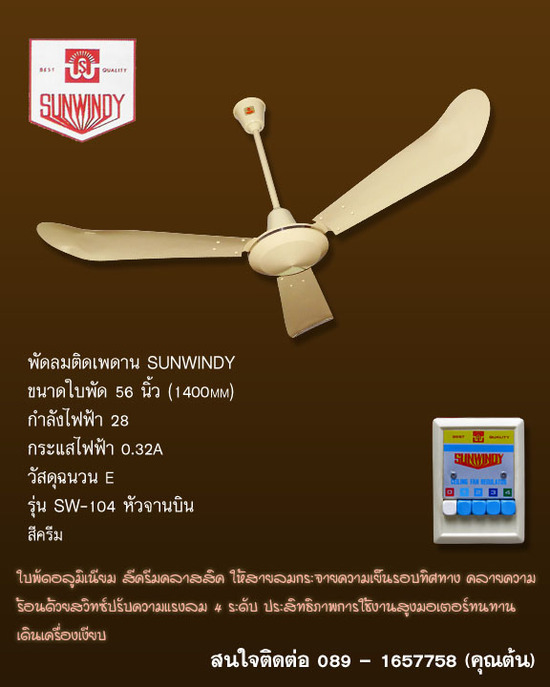 พัดลมติดเพดาน ซันวินดี้ sunwindy ขนาดใบพัด 56 นิ้ว รุ่น c-104 หัวจานบิน ใบพัดกระดก สีครีมสวยสะอาดตา ใบพัดลมโค้งสวยกินลมได้ดี ใบพัดลมและมอเตอร์เป็นอลูมิเนียม สวิทซ์เร่งความเร็วแบบกด 4 เบอร์ เย็นแบบจัดหนัก ทนทาน เดินเครื่องเงียบ สำหรับร้านอาหารหรืออาคาร โรงแรมต่างๆที่กำลังต้องการพัดลมเพดาน รุ่นนี้เป็นรุ่นลมเย็นจัดหนัก เหมาะสำหรัับติดในที่กว้าง ติดต่อผมได้เลยครับ 089-1657758 ต้นครับ