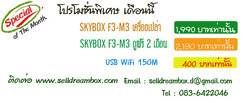 Skybox F3-M3 HD 1080p ขาย 1,990 บาท ประกันบวกลงโปรแกรมพร้อมดู - เดือน (083-6422046) Skybox F3-M3 HD 1080p ขาย 2,190 บาท ประกันบวกลงโปรแกรมพร้อมดู 2 เดือน (083-6422046) อุปกรณ์ ในกล่อง 1. ตัวเครื่อง มีนาฬิกาพร้อมช่อง 2. ชิพแท้จากโรงงาน SKYBOX.CC ของแท้แน่นอน 3. รีโมท+อแดปเตอร์ 4. สาย MINI AV+สาย HDMI 5. คู่มือ+สาย RS232 +ถ่าน AA 2ก้อน 6. IR Sensor