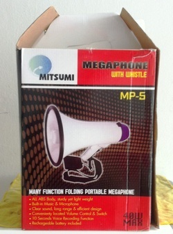 โทรโข่ง MITSUMI MP-5 กำลัง 40w - อัดเสียงได้ มีนกหวีด - มีแบตเตอรีให้ แบตใช้งานได้ 8-10 ช.ม. -ใช้ถ่านขนาด D * 4 pcs -ขนาดหน้ากว้าง 205 mm สูง 340 mm -น้ำหนัก 1.5 kg