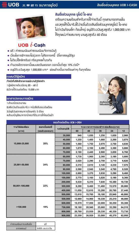 •อนุมัติสินเชื่อยูโอบี ไอแคช (UOB I-Cash) ให้วงเงินสูงสุด 5 เท่า แต่ไม่เกิน 1,000,000 บาท ไม่ต้องมีบุคคลคำประกัน ดอกเบี้ยต่ำสุดเพียง 19%ต่อปี (สำหรับวงเงิน 100,000 บาท)