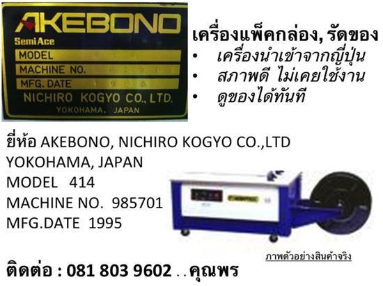 เครื่องแพ็คกล่อง, รัดของ •เครื่องนำเข้าจากญี่ปุ่น •สภาพดี ไม่เคยใช้งาน •ดูของได้ทันที ยี่ห้อ AKEBONO, NICHIRO KOGYO CO.,LTD YOKOHAMA, JAPAN MODEL 414 MACHINE NO. 985701 MFG.DATE 1995