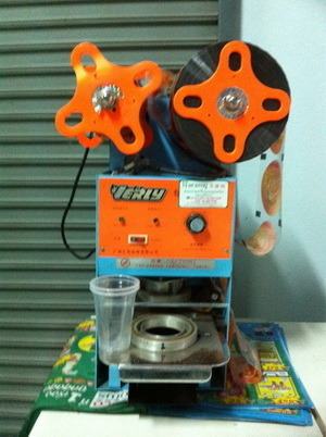 เครื่องซีลฝาพลาสติค ทำจากเนื้อเหล็กอย่างดี ทนทานต่อการใช้งาน สามารถซีลแก้ว ใส่น้ำ เช่น น้ำส้มคั้น น้ำเก็กฮวย การทำงานแบบเซมิออโต้ ใช้ระบบไฟฟ้า กินไฟน้อย แถมพลาสติคปิดปากแก้ว 2 ม้วนและแก้วจำนวน 1,500 ใบ